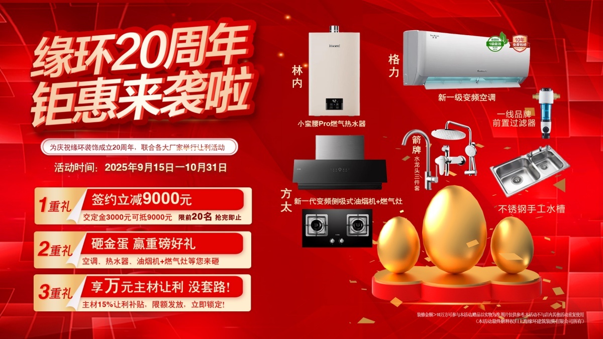 上海缘环装饰20周年庆火热开启!即日起至10月31日,签约立减9000元,砸金蛋100%赢家电豪礼,主材采购再省15%!20年匠心服务,零增项透明装修,隐蔽工程终身保修。名额有限,速约参观在施工地,解锁理想家!