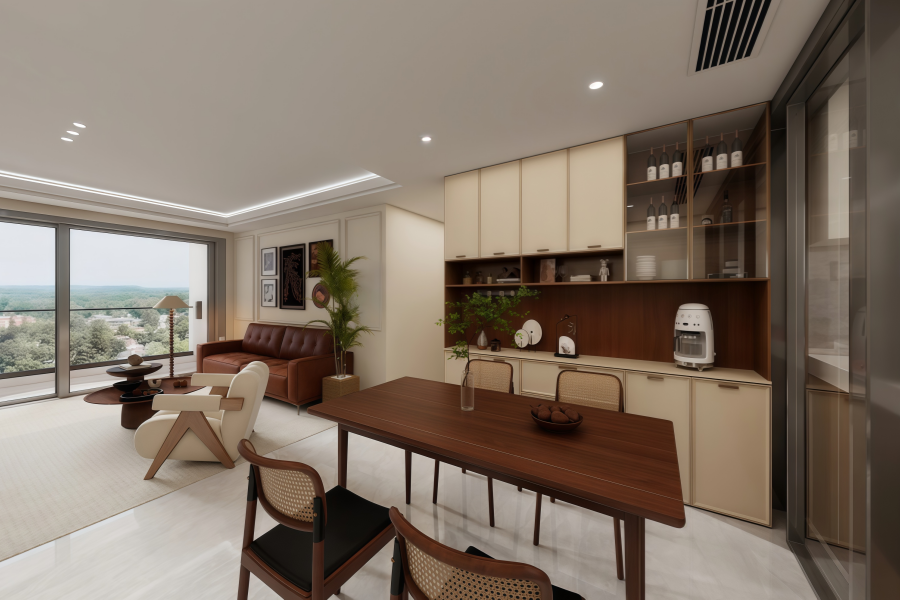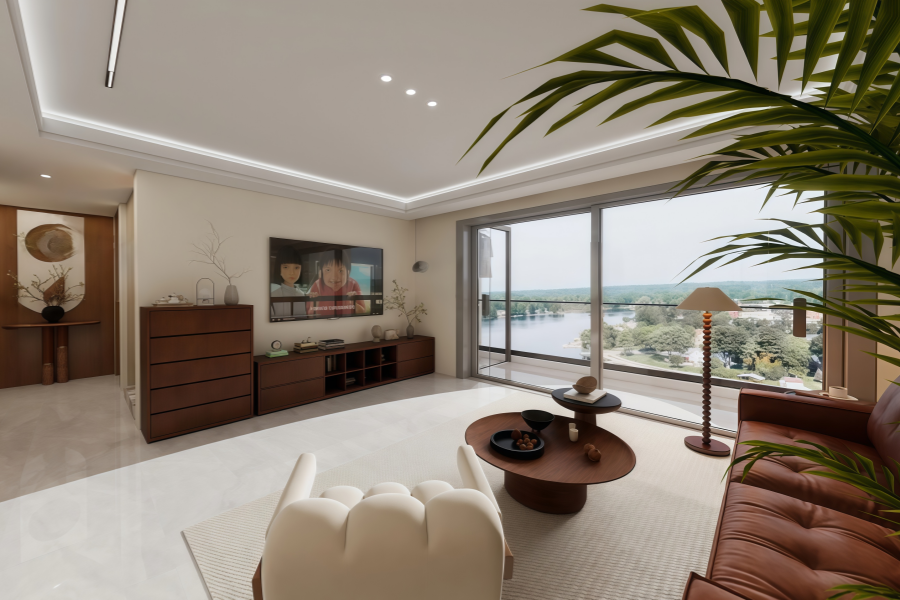 踏入客厅,仿佛置身于温柔的梦境。柔和的奶油色墙面与温润的原木家具相得益彰,营造出宁静而舒适的氛围。电视墙简约而不失格调,深棕的电视柜与斗柜有序排列,收纳与展示功能兼备。米白的单人沙发椅造型独特,柔软舒适;棕色的皮质沙发则散发着复古的魅力。大面积的落地窗如同一幅天然的画卷,将窗外的湖光山色与绿意盎然引入室内,阳光肆意倾洒,让空间愈发通透明亮。