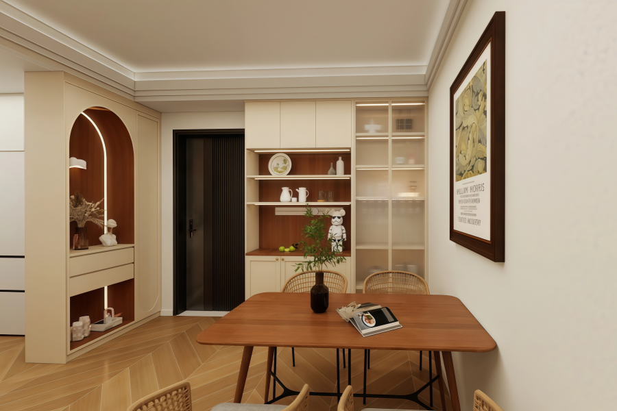 餐厅的改造同样可圈可点。拱形展示柜兼具美观与实用,里面陈列的装饰品在灯光的映照下熠熠生辉,为用餐时光增添了不少情调。木质餐桌与藤编座椅的组合,自然又舒适,营造出温馨的用餐氛围。墙上的装饰画,进一步丰富了空间的艺术感。