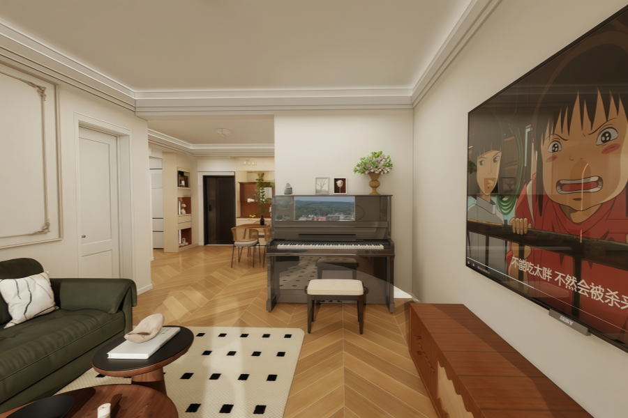 改造后的客厅,仿佛一幅柔和的画卷。淡雅的米白色墙面,搭配精致的线条装饰,奠定了法式风格的优雅基调。大屏电视上生动的画面成为视觉焦点之一,深绿色的沙发犹如画龙点睛之笔,为空间增添了一抹沉稳与高级。圆形木质茶几上,简单的摆件透露出生活的精致感。当阳光透过拱形窗户倾洒而入,窗外的湖光树影与室内的温馨氛围融为一体,让人仿佛置身于浪漫的法式田园。