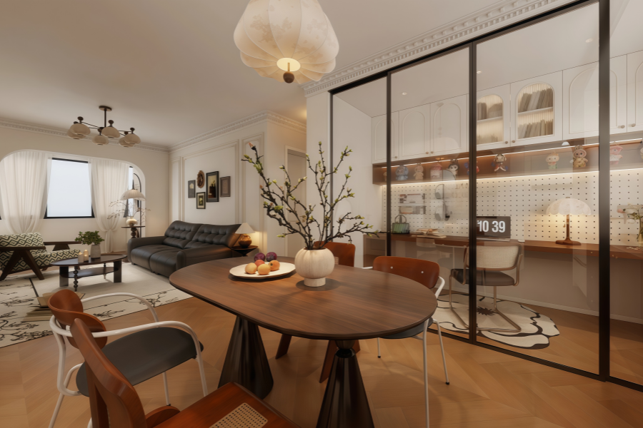 空间布局为客餐厅一体、玻璃隔断书房、卧室静谧私密、卫浴精致实用,动线流畅,功能分区清晰,同时通过弧形门洞、石膏线、复古家具等元素串联,让空间既有独立个性,又有整体协调感。