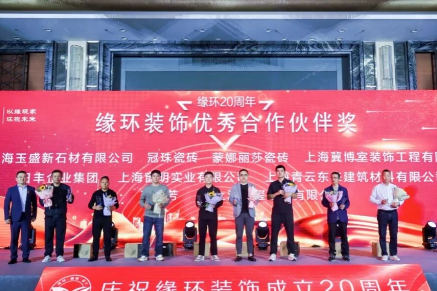 在庆典现场,我们特别颁发了“优秀合作伙伴”奖,他们是:上海玉盛新石材有限公司、冠珠瓷砖、蒙娜丽莎瓷砖、上海冀博室装饰工程有限公司、日丰企业集团、上海窗明实业有限公司、上海青云东来建筑材料有限公司、王从芳、上海鲁玺工贸有限公司,向9家与缘环装饰并肩作战、共铸卓越的伙伴们致以最诚挚的感谢与敬意!