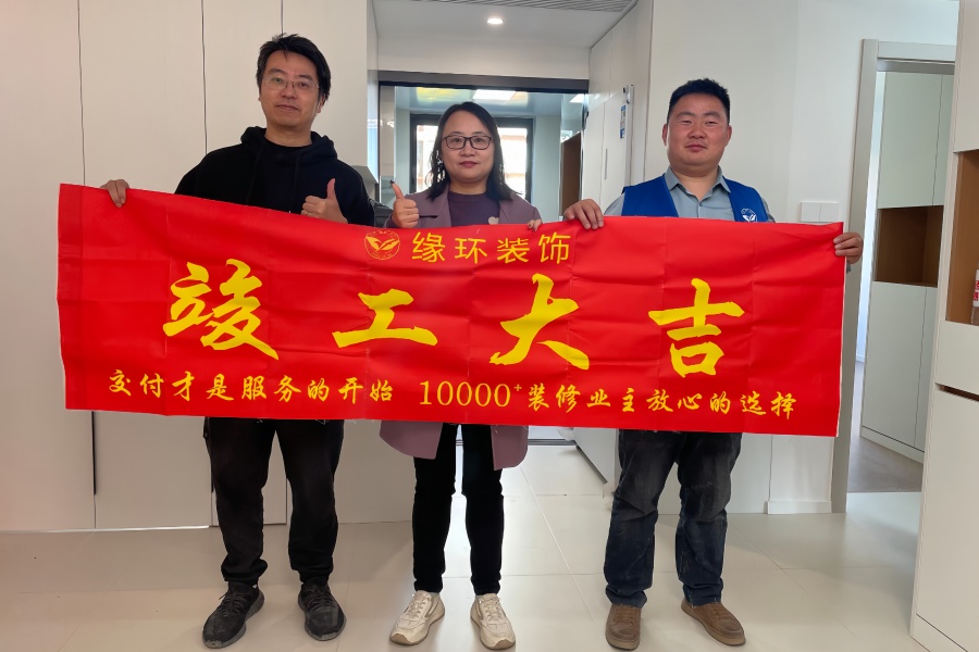 在竣工现场,业主与上海缘环装饰的项目工长共同举起了象征吉祥与顺利的红色横幅,每个人的脸上都洋溢着喜悦的笑容。业主表示,这次翻新不仅让老房子的面貌焕然一新,更在细节处体现了缘环装饰的用心与专业。从设计到施工,每一个环节都让人感到放心和满意。