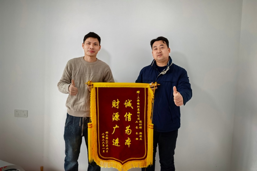 锦旗寥寥八字,承载深厚信任。在黄浦区斜土路486弄项目全程中,韩俊杰设计师以专业视角精准把握业主需求,方案沟通透明细致;朱强工长带领施工团队严守工艺标准,进度清晰、用料扎实,及时响应每一处细节关切。业主坦言:“从设计到落地,他们用真诚与匠心让我们全程安心,真正做到了言出必行。”