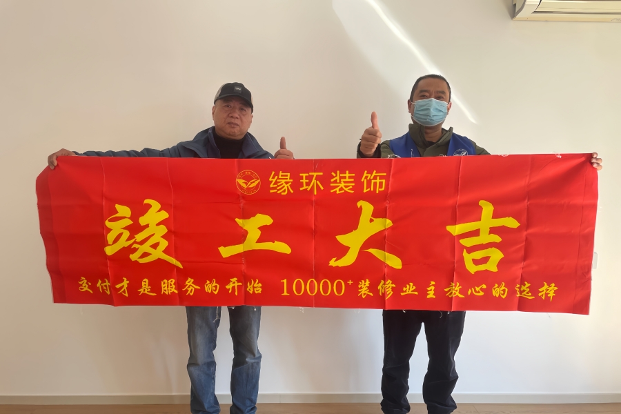 随着验收的圆满结束,王工与业主共同展开了那条象征吉祥与满意的红色横幅——“竣工大吉”。横幅上的黄色大字,不仅是对工程顺利完成的庆祝,更是缘环装饰“客户至上,服务为王”理念的生动诠释。