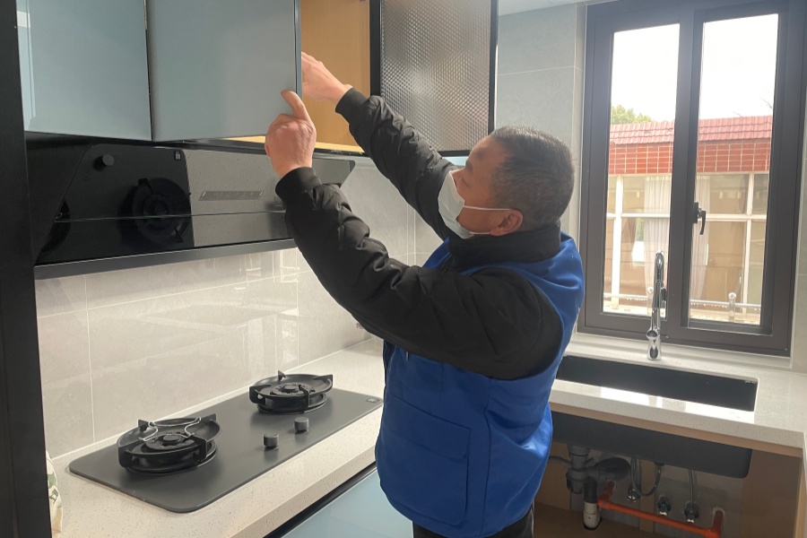 验收当天,工程部经理与施工队长一同深入工地现场,从水电线路、墙面地面、橱柜安装到门窗开合、细节收口,逐一进行严格检查。工程部经理仔细核对施工标准,施工队长同步记录并现场协调完善。整个验收过程严谨有序,体现了缘环装饰对施工质量的高度重视和对客户负责的服务态度。